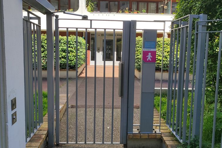 Il cancello è sulla destra in questa strada a senso unico. È un cancello scorrevole con rete metallica.